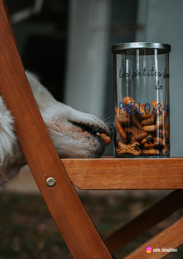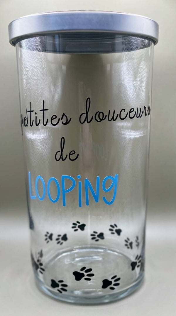 Pot de conservation pour les friandises ou autres de votre poilu.Couleur du prénom au choix.La partie en verre passe au lave vaiselle.Contenance: 1285ml