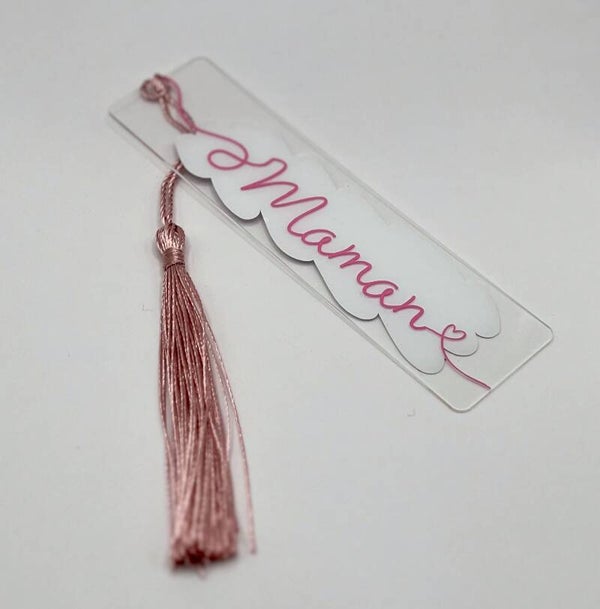 Marque page acrylique.Plusieurs choix de texte possible.Couleur du petit pompon aléatoire.Taille: 12 cm