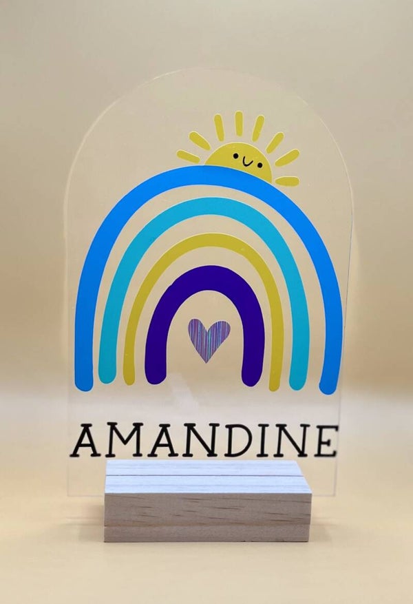 Plaque en plexi sur son support en bois. Spécial enfant. Taille du plexi: 15x10cm Taille du support en bois : 7x3.5x1.8cm Couleur de la giraphe au choix. La 2ème photo n'est que pour l'exemple.