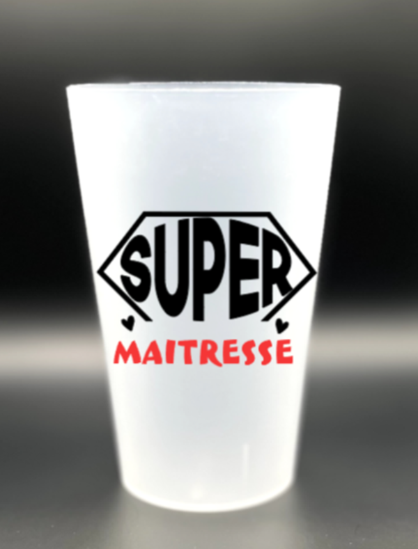 Gobelet Réutilisable, Super ATSEM, Maitresse, Maitre, Nounou Couleur du texte au choix.Contenance: 25cl (33cl à ras-bord) Passe au lave vaisselle. Pour une commande de + de 3 gobelets nous contacter (tarifs dégressifs).